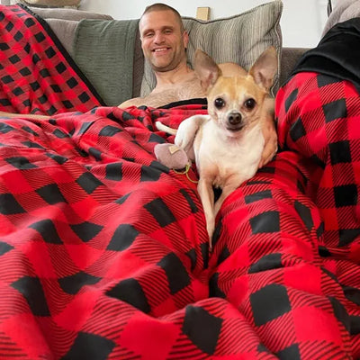 Red plaid and white fleece blanket with a 'Big Blanket Co' label.